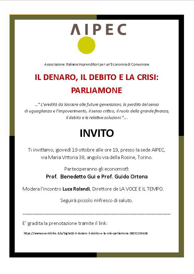 Ti invitiamo giovedì 19 ottobre all’incontro dal titolo “IL DENARO, IL DEBITO, LA CRISI: PARLIAMONE”, organizzata da AIPEC, l’associazione italiana degli imprenditori per un’Economia di Comunione presso la sede AIPEC di Torino, via Maria Vittoria 38 (angolo via della Rosine) dalle ore 19.