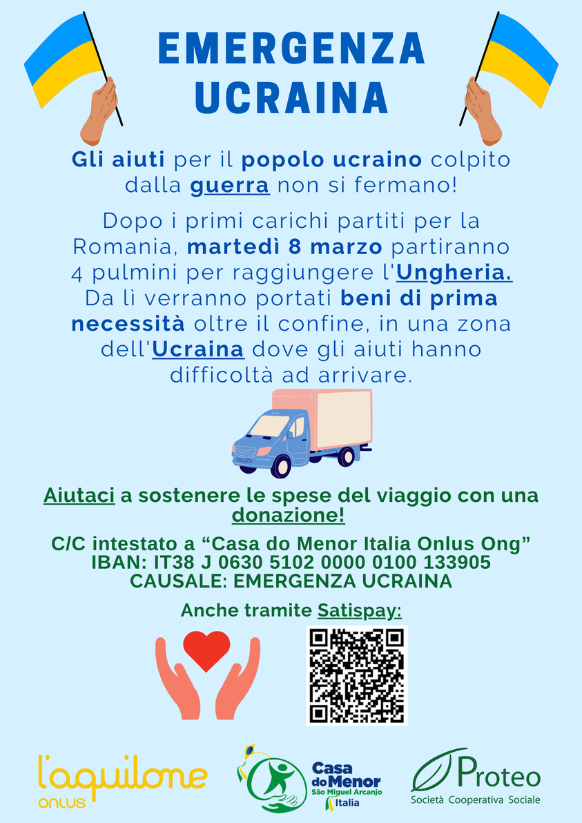Aiutaci a sostenere le iniziative a supporto del popolo ucraino con una donazione!CAUSALE: EMERGENZA UCRAINA
