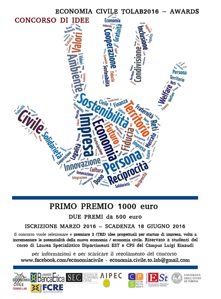 TORINOLAB AWARDSAIPEC e SEC, Scuola di Economia Civile, sono tra i proponenti del concorso di idee “ECONOMIA CIVILE TOLAB2016 – AWARDS”, un progetto di condivisione di valori e di idee progettuali, che si pone l’obiettivo di premiare idee progettuali per STARTUP DI IMPRESE volte a incrementare l’efficacia e l’impatto della cd. Economia civile o nuova economia.