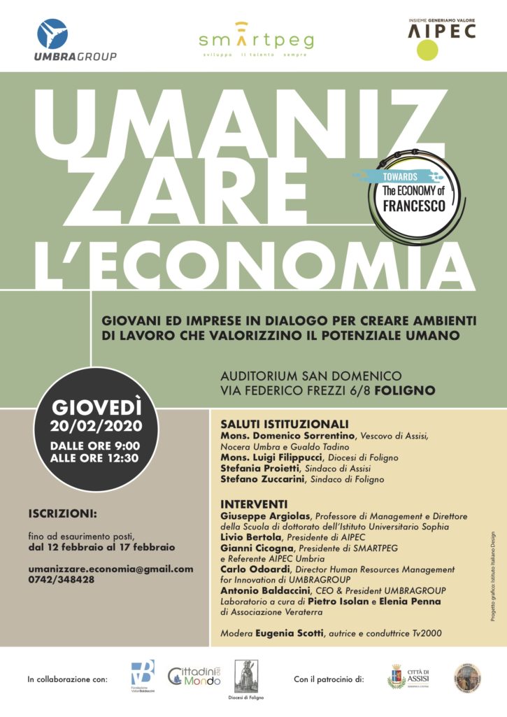Giovedì 20 febbraio 2020 dalle ore 9.00 alle 12.30 nell’Auditorium San Domenico di Foligno, Largo F. Frezzi n° 8, in preparazione al grande appuntamento di Assisi “The Economy of Francesco” voluto da Papa Francesco 26 -28 marzo 2020, UMBRAGROUP, Smartpeg e AIPEC, in collaborazione con Fondazione Valter Baldaccini e il Progetto Cittadini del Mondo promosso dalla Diocesi di Foligno, stanno organizzando un incontro per gli studenti delle scuole secondarie di secondo grado dal titolo