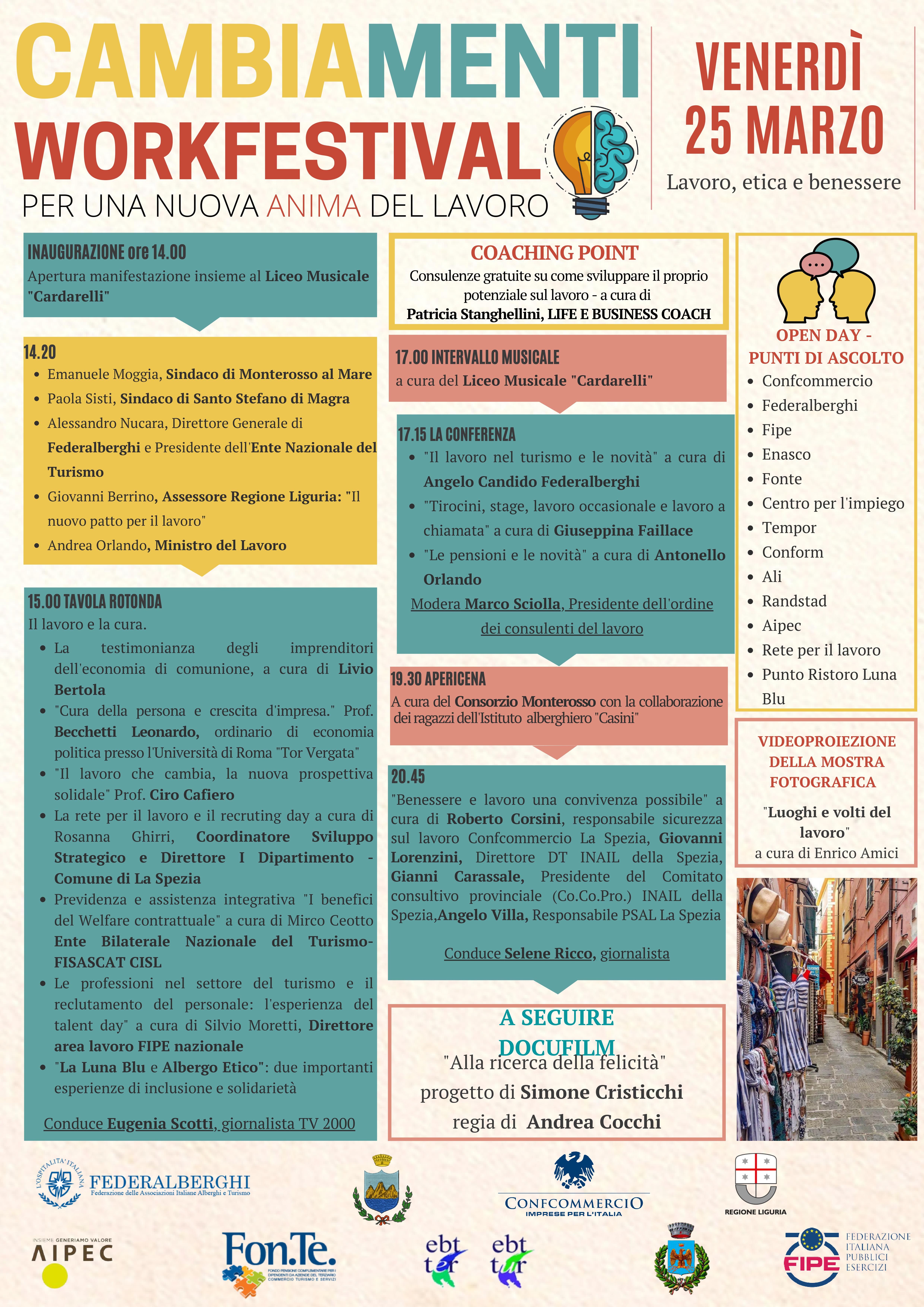 Nelle giornate di venerdì 25 e sabato 26 marzo si terrà la 2° edizione della Manifestazione sul lavoro organizzata da Confcommercio La Spezia, nella località di Monterosso al Mare.