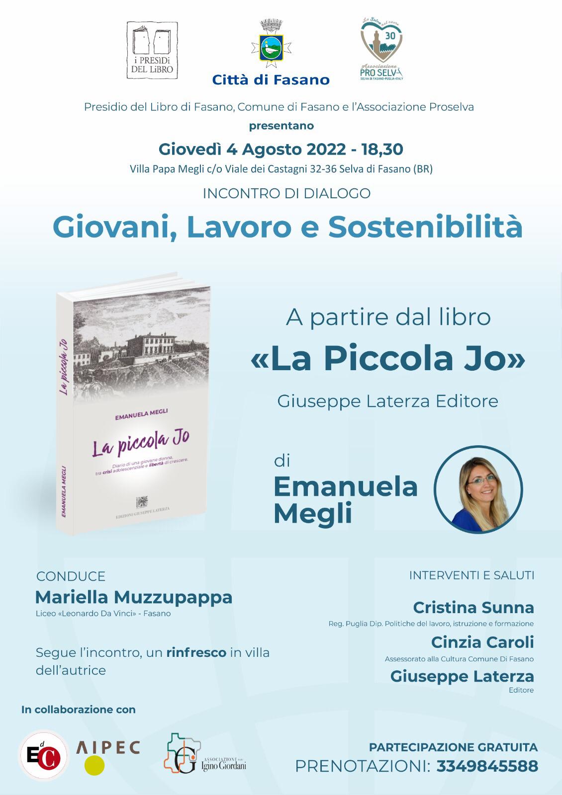 Giovedì 4 agosto, nella villa della Selva di Fasano, si parlerà di GIOVANI, LAVORO E SOSTENIBILITÀ con l’ ultimo libro di Emanuela Megli (socia e referente AIPEC per la Puglia) intitolato “La piccola Jo”.