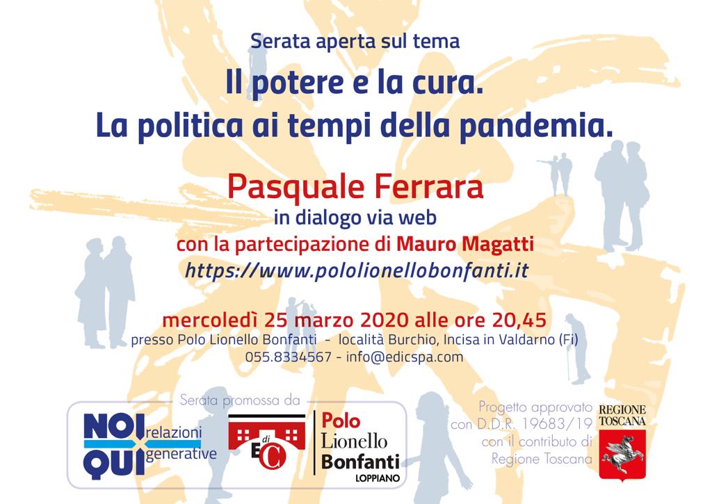 Mercoledì 25 marzo, alle 20.45, sarà in collegamento per un webinar dal titolo “Il potere e la cura. La politica ai tempi della pandemia.” Pasquale Ferrara con la partecipazione di Mauro Magatti.