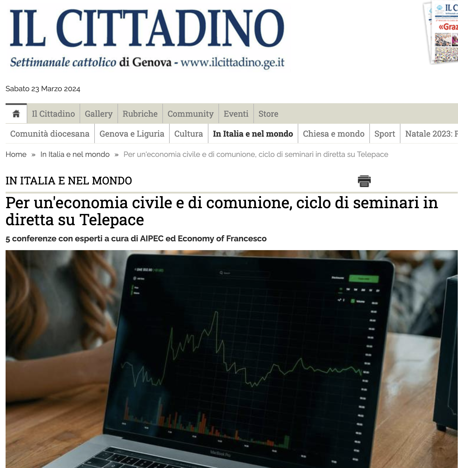 Parlano di noi: articolo del settimanale genovese “il cittadino”. Per un’economia civile e di comunione, ciclo di seminari in diretta su Telepace