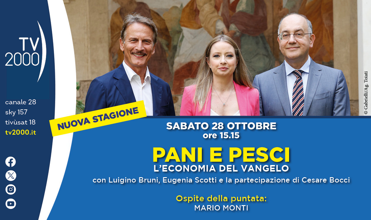 Sabato 28 ottobre ore 15:15 va in onda la 4° puntata di “Pani e Pesci. L’economia del Vangelo” condotto da Eugenia Scotti con il prof. Luigino Bruni e la partecipazione di Cesare Bocci.