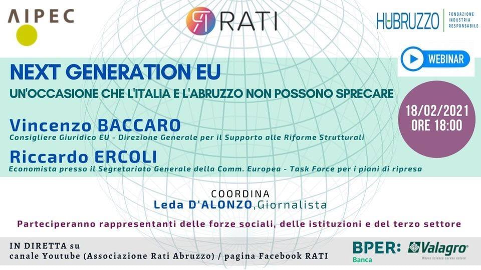 Vi segnaliamo un interessante evento dal titolo “NEXT GENERATION EU: UN’OCCASIONE CHE L’ITALIA E L’ABRUZZO NON POSSONO SPRECARE” è il primo di una serie di webinar che si terranno da febbraio 2021 e nei prossimi mesi, promossi da R.A.T.I. Rete di abruzzesi per il talento e l’innovazione – in partnership con la Fondazione Hubruzzo e con noi di A.I.P.E.C. – Associazione Italiana Imprenditori per l’Economia di Comunione – Abruzzo.
